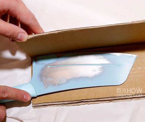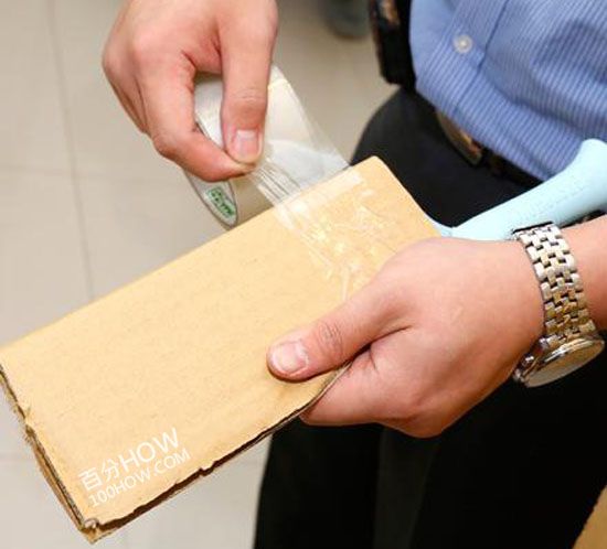 b、再把厚紙板完整包覆住刀身后,讓刀鋒朝向瓦楞紙的折痕處,并用膠帶封緊開(kāi)口。